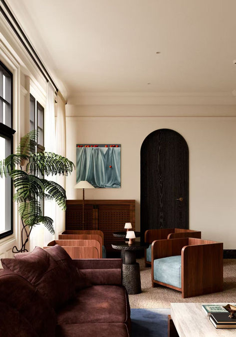 Velvet, linen, natural wood, and stone are composed to evoke a gentle warmth, while curated artworks enrich the space with cultural depth and artistic resonance. A palette of muted deep green, burgundy, camel, and beige enhances the sense of calm refinement, also blue to balance and neutralize the warm tone, enveloping visitors in a feeling of ease and grace. More than a medical facility, the clinic emerges as a haven where art, lifestyle, and function are seamlessly intertwined.